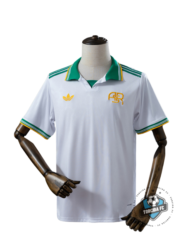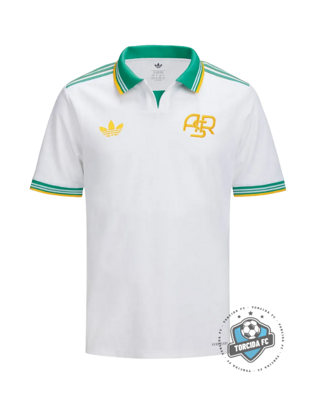 🇧🇷 Camisa AS Roma 25/26 ThirdA camisa Third da Roma 25/26 aposta em um visual clássico e sofisticado. Com base branca, gola polo tradicional e detalhes em verde e dourado, o modelo remete à elegância do futebol europeu com um toque moderno. Discreta, estilosa e confortável, é ideal para jogos, uso casual ou para quem valoriza um design atemporal.