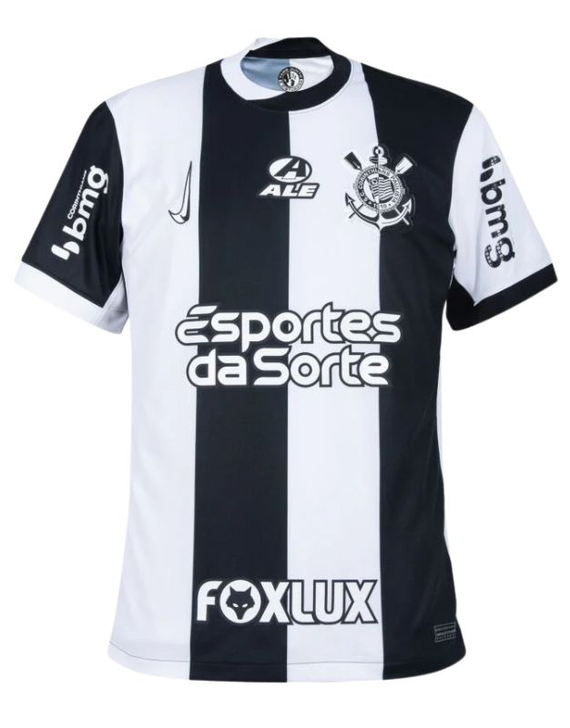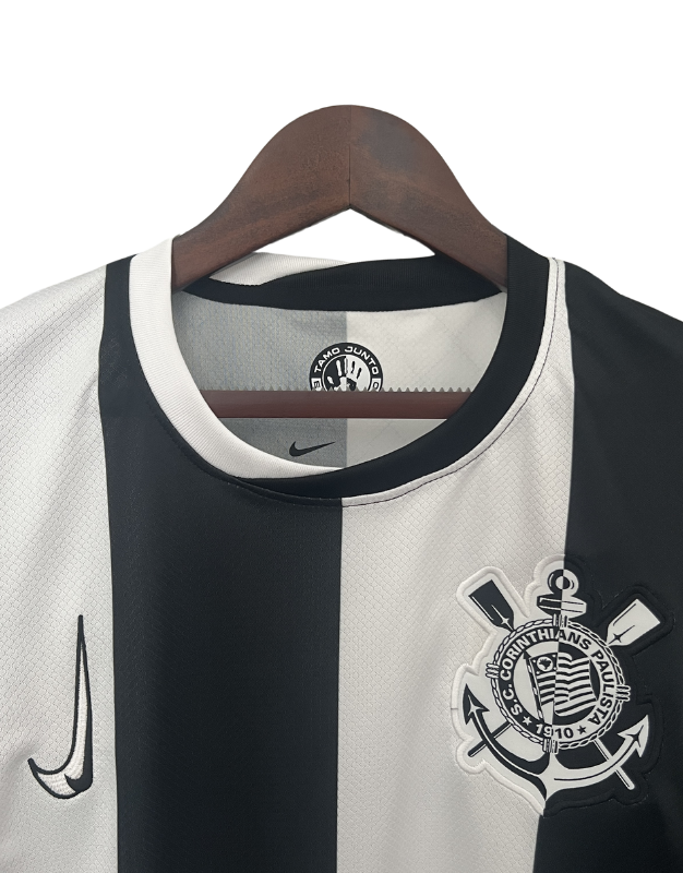 🇺🇸 The Corinthians 24/25 Third Jersey, designed by Nike, pays tribute to the club’s rich history and unwavering tradition. Featuring a classic black and white striped design, this third kit for the 2024/2025 season embodies the essence of Corinthians. The embroidered club crest on the left chest and the Nike Swoosh on the right add authenticity and style. Made with Dri-FIT technology, this jersey ensures breathability and moisture-wicking comfort, keeping you dry whether you’re cheering in the stadium or wearing it casually.