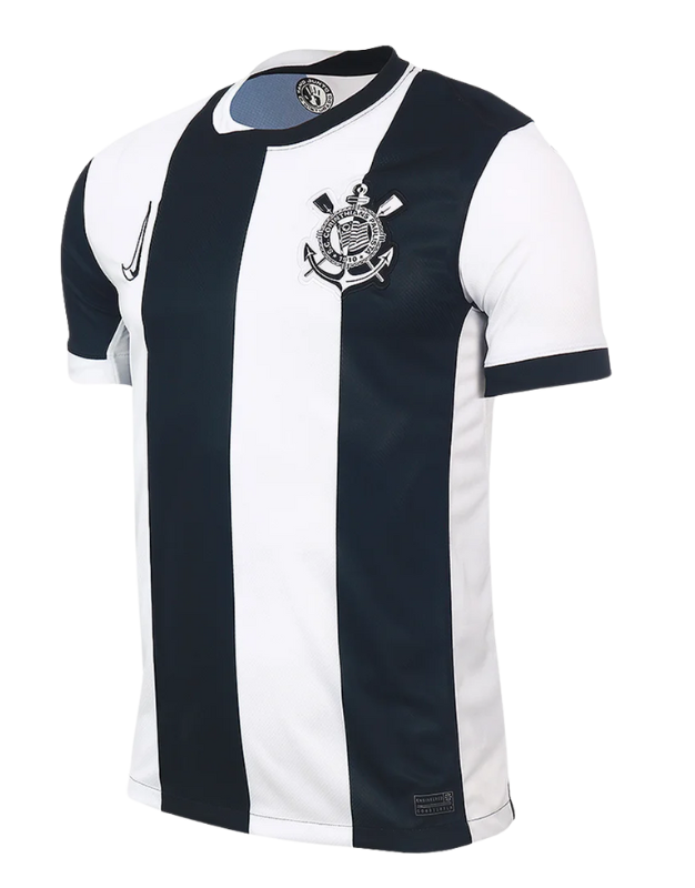 🇧🇷 A Camisa Corinthians Third 24/25, desenvolvida pela Nike, é uma homenagem à rica história e tradição do Sport Club Corinthians Paulista. Com um design clássico de listras verticais em preto e branco, esta terceira versão do uniforme para a temporada 2024/2025 simboliza a essência alvinegra que caracteriza o clube. O escudo bordado no peito esquerdo e o logo Nike Swoosh no lado direito garantem autenticidade e estilo. Confeccionada com a tecnologia Dri-FIT, a camisa proporciona excelente respirabilidade e conforto, mantendo o torcedor seco e confortável durante os jogos e no dia a dia.