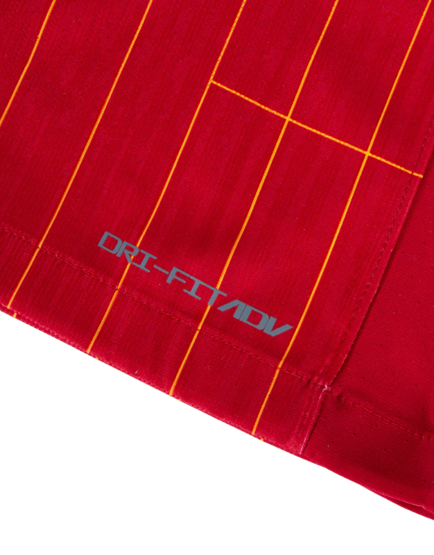 This jersey features a classic red design adorned with subtle pinstripes and a banded, cutaway collar, reflecting the style of the original kit. The return of yellow accents adds a fresh touch, reintroducing this color for the first time in five years.