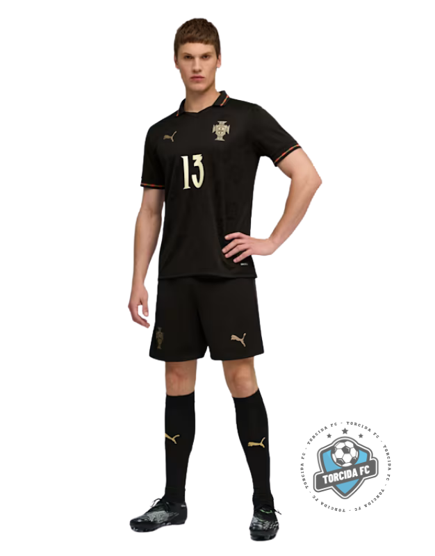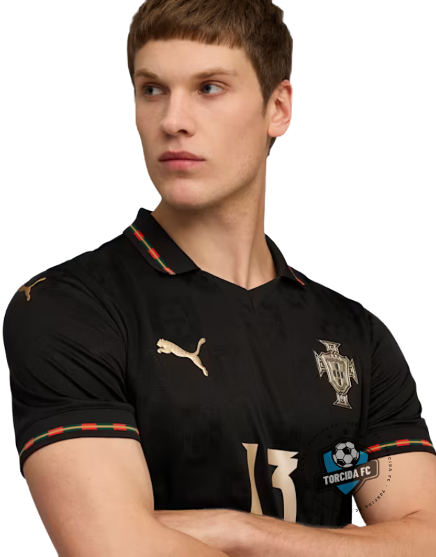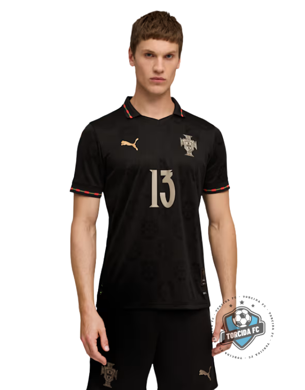 🇧🇷 Preto e dourado — a lenda continua.A Camisa Portugal 25/26 Edição Especial chega em preto premium com detalhes dourados e toques em verde e vermelho, em homenagem ao eterno camisa 13, a Pantera Negra. Trata-se de uma edição comemorativa que celebra a história da seleção. Tecido leve e respirável para torcer com estilo, dentro e fora do estádio.